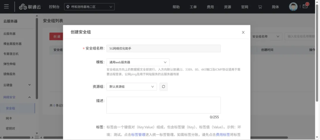 1、在云主机创建安全组,模板选“通用web服务器”,放开22端口