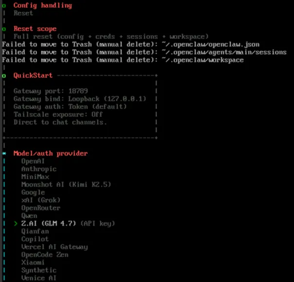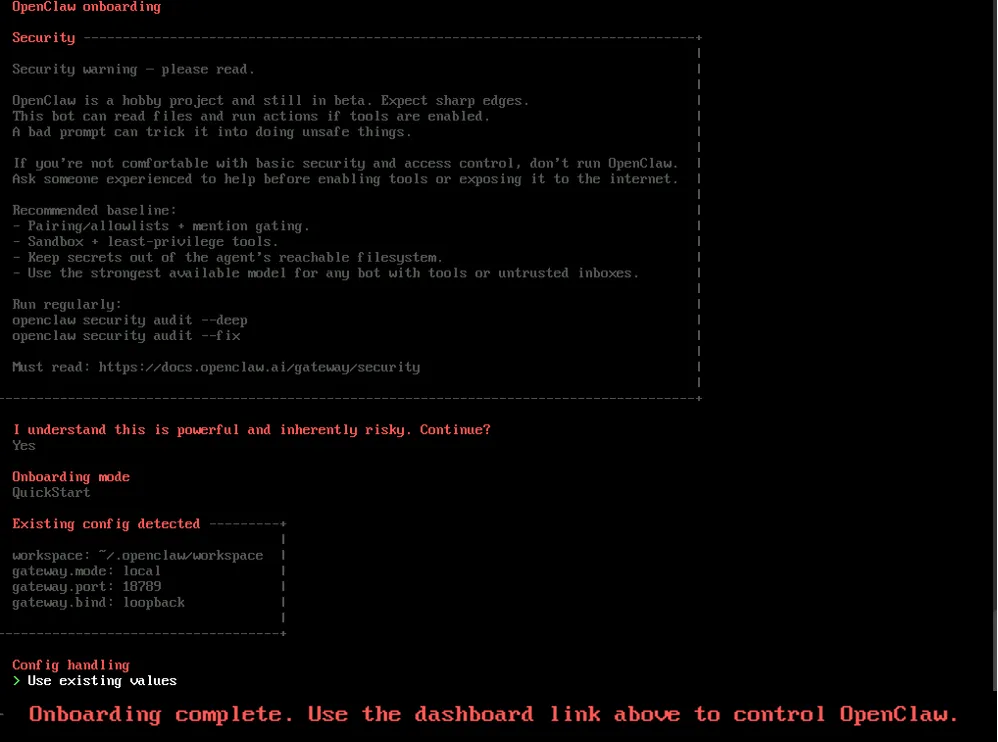 四、执行openclaw onboard初始化OpenClaw,按提示配置就好。配置完成,会显示“Onboarding complete,Use the dashboard link above to control.”ctrl+C退出