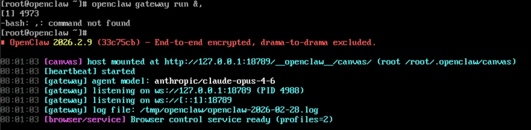 五、Gateway负责统一接收、转发、校验所有客户端与后端服务的通信。如果您选择的是OpenClaw-CUlinux 3.0 64位(标准版)镜像:您需要再输入 openclaw gateway run &,让Gateway服务运行
