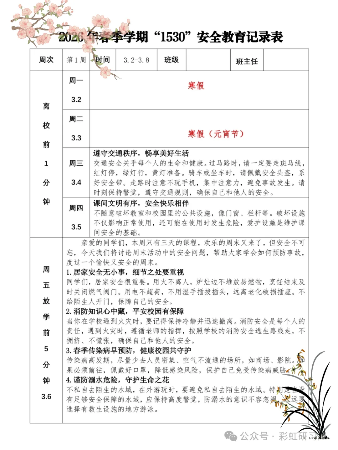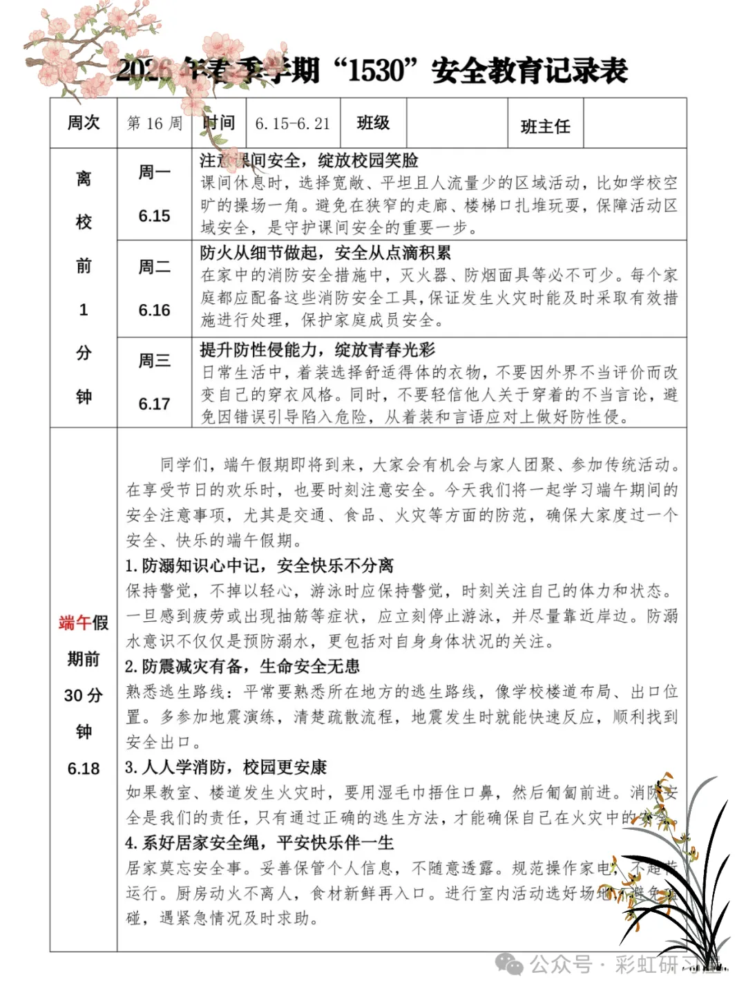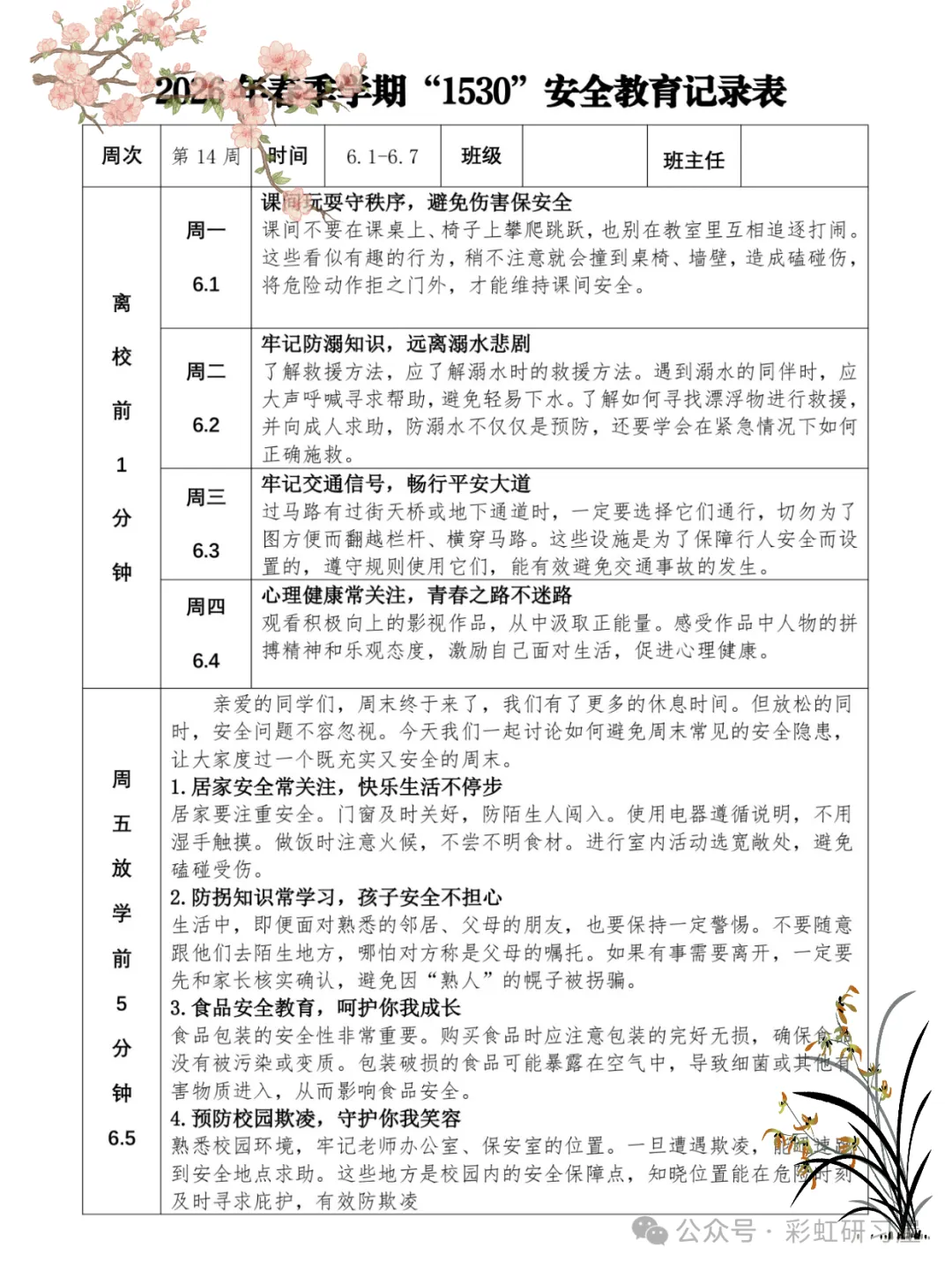直接下载使用,26 年春季1530 安全教育记录表”写完了!