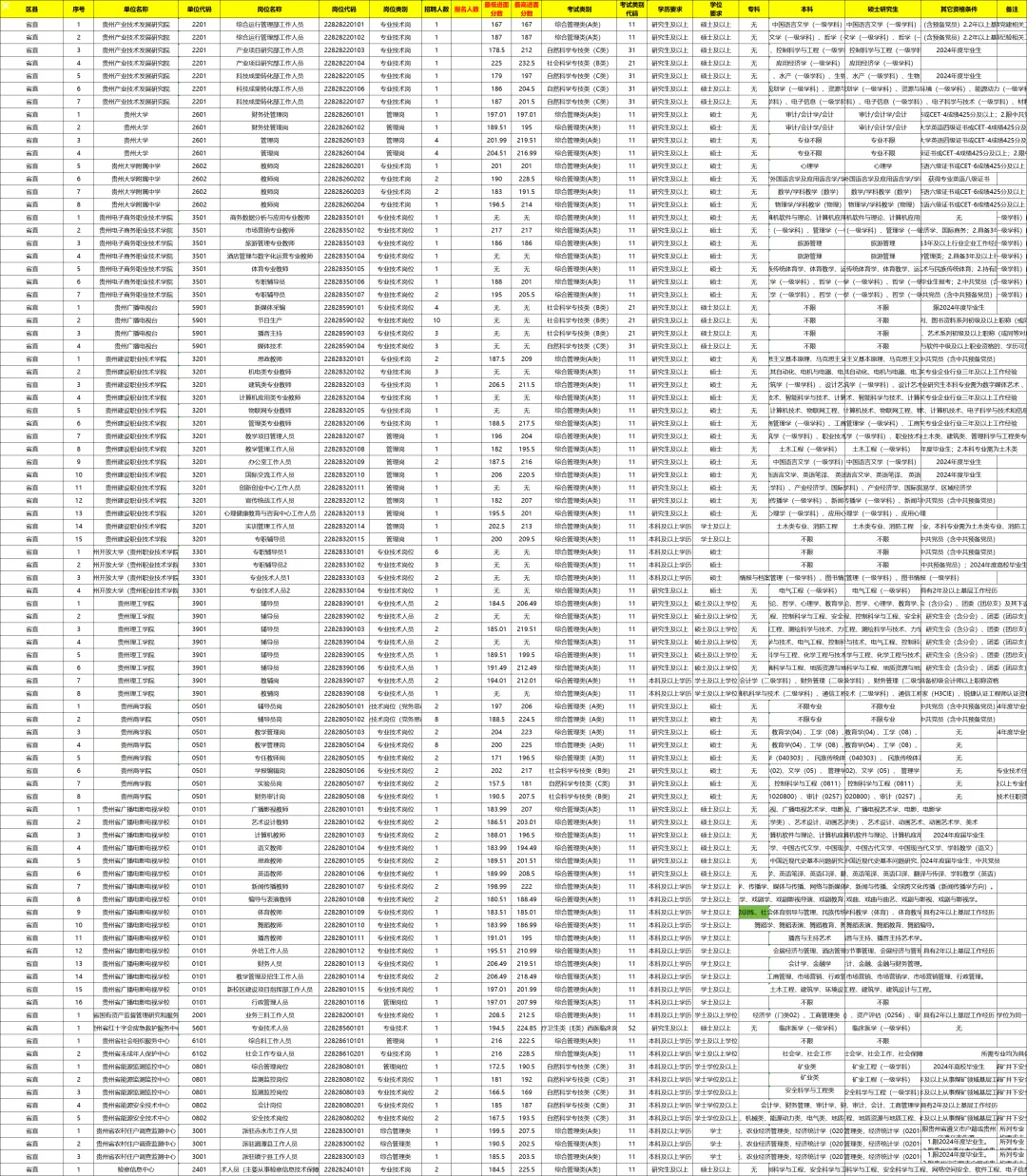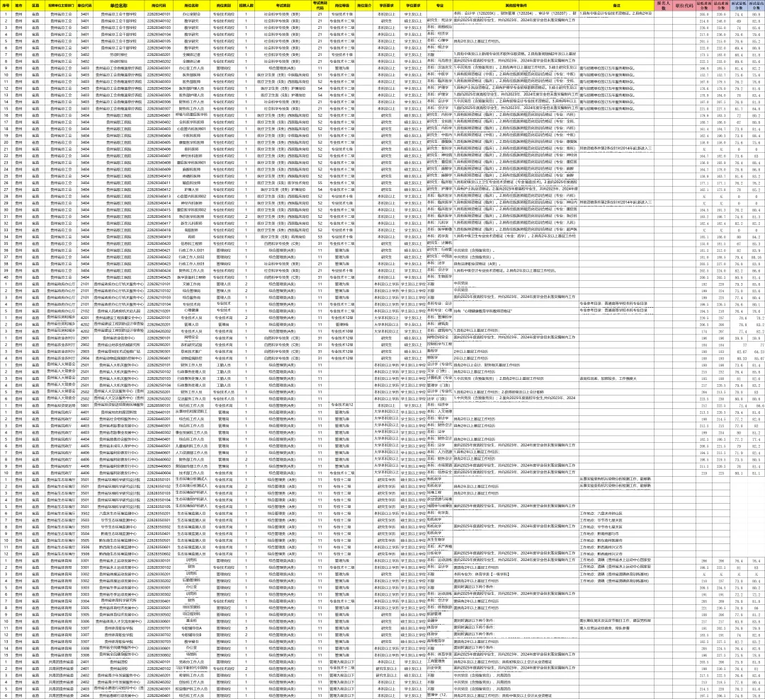 2025年贵州事业单位进面分数线因地区、岗位类别不同而有所差异,以下是部分地区和岗位的进面分数线情况供参考: