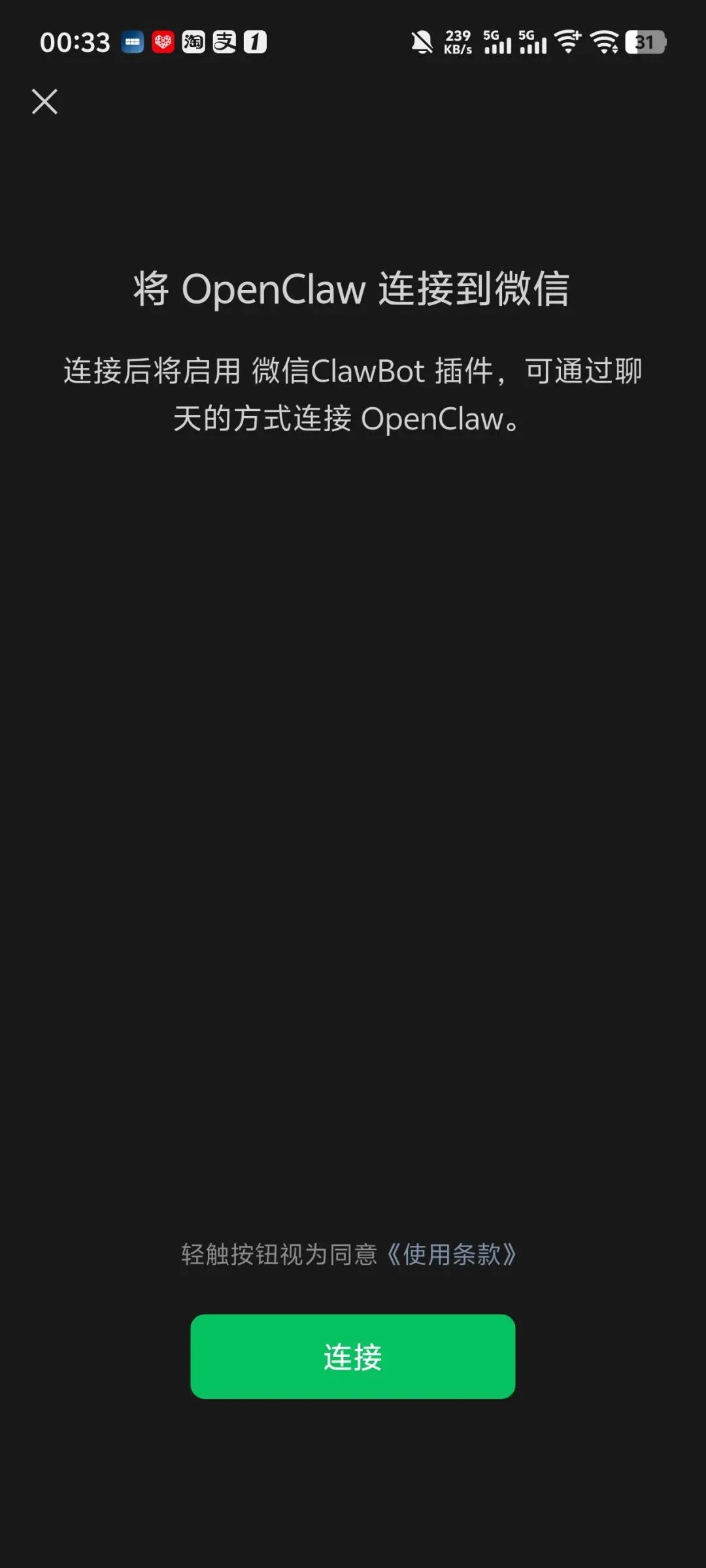 使用的是链接openclaw的渠道,本来以为要升级到微信到8.0.70才有,隔壁iOS已经更新了,安卓这边看了几天还是8.0.69,但是直接扫二维码就可以使用。