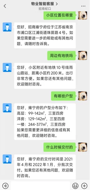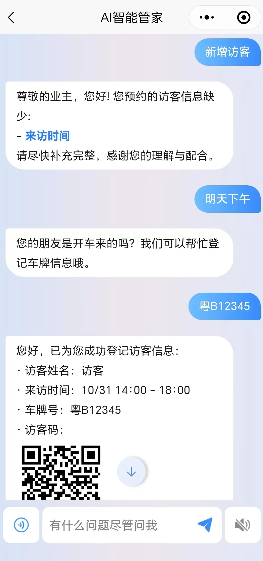 从社区通知到访客预约,从物业查询到装修报备......AI智能客服不仅能精准处理指令,还能主动推送服务进度、提醒事项,实现从“被动服务”到“主动关怀”的跨越。