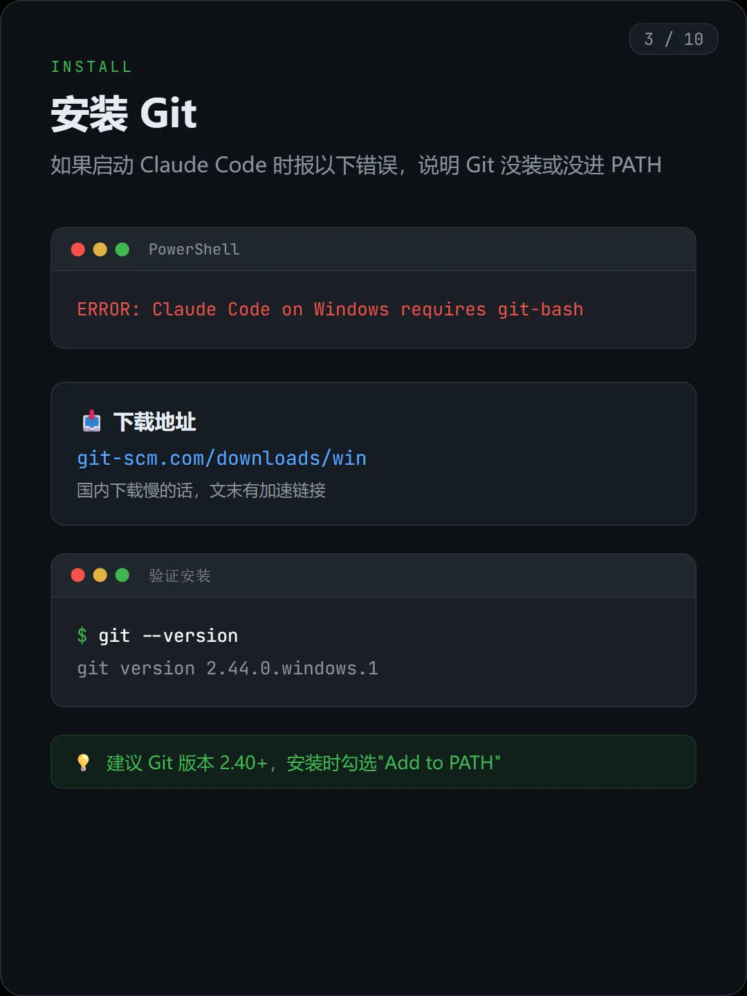 为什么一定要有 Git? 因为 Claude Code 在 Windows 下会依赖相关环境,如果你机器上没有 Git,或者 Git 没有正确加入 PATH,后面很容易直接报错。