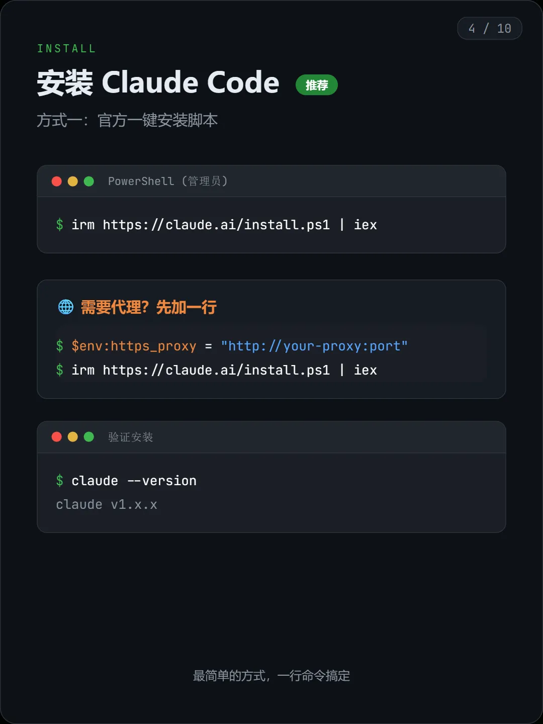 $env:https_proxy = "http://your-proxy:port"irm https://claude.ai/install.ps1 | iex安装完成后,执行下面这句检查: