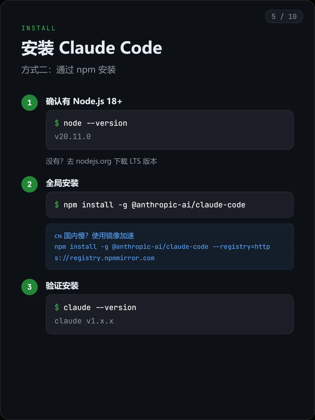 除了官方脚本,Claude Code 也可以通过 npm 全局安装。
