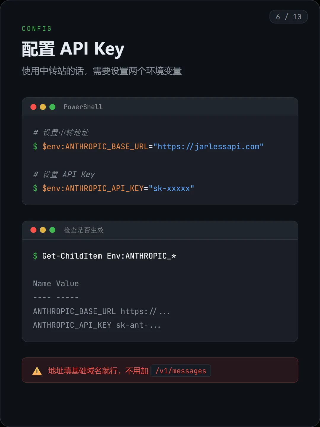 # 设置中转地址$env:ANTHROPIC_BASE_URL="https://你的中转地址"# 设置 API Key$env:ANTHROPIC_API_KEY="sk-xxxxx"设置完后,你可以检查一下是否生效: