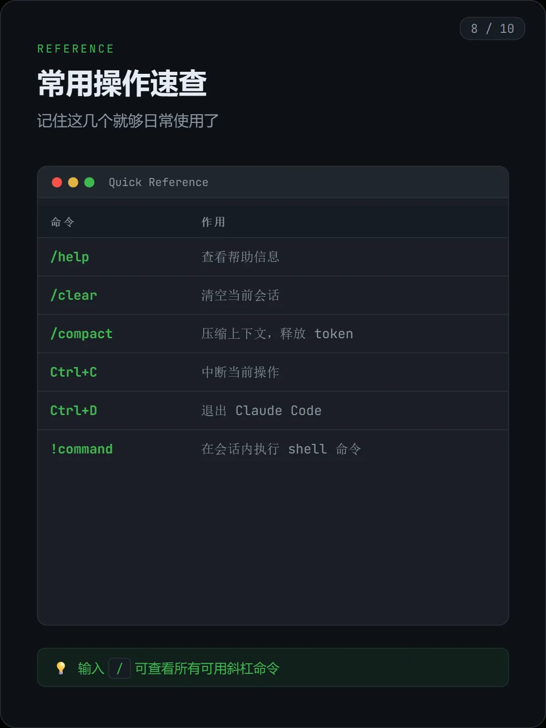 /help:查看帮助/clear:清空当前会话/compact:压缩上下文,减少 token 占用Ctrl + C:中断当前操作Ctrl + D:退出 Claude Code!command:在会话内执行 shell 命令