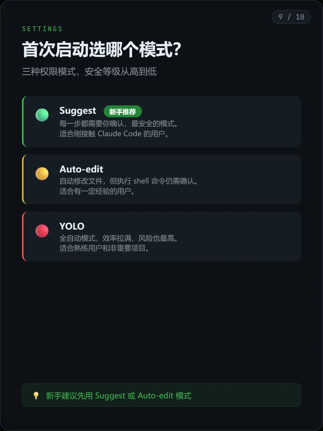Suggest每一步都要确认,最安全,最适合新手Auto-edit允许自动改文件,但执行命令还会让你确认YOLO全自动,效率最高,但风险也最大