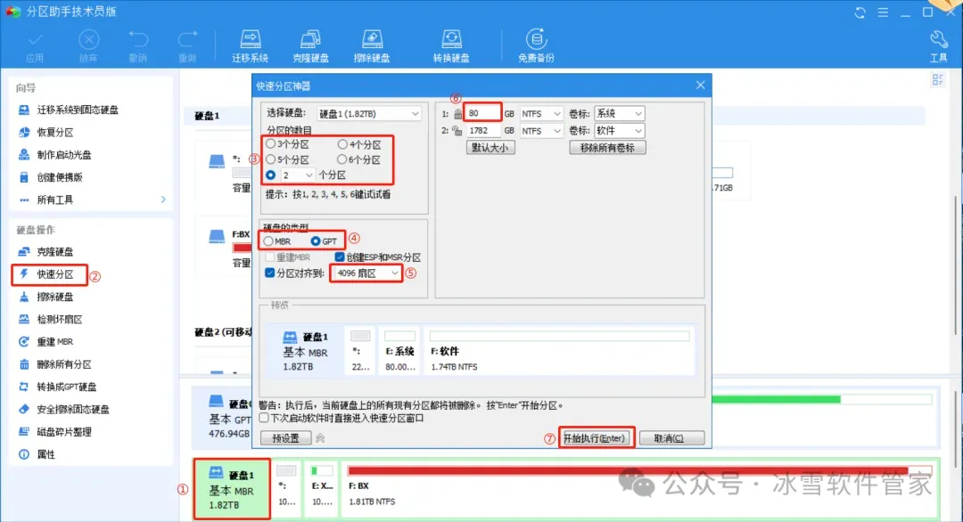 第一种:重新分区,新电脑或者新硬盘,①鼠标选中要分区的【磁盘】②点击【快速分区】③选择要分几个分区(我这里选的2个分区)④选择磁盘类型选【GPT】,⑤选【4096扇区】,⑥输入系统的大小(建议80G以上)⑦点击【开始执行】