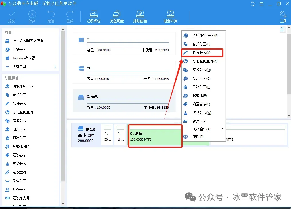 1)选择需要拆分的磁盘(如:C盘),鼠标右击【C:】选择【拆分分区】。