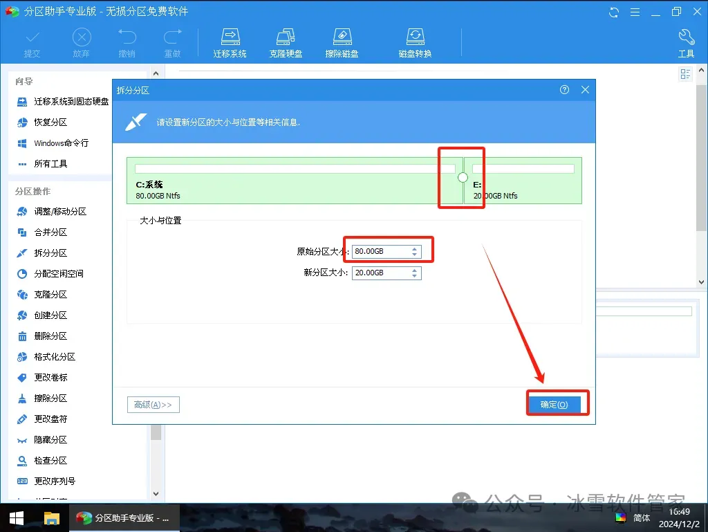 2)鼠标左右拖动选择磁盘容量(右侧为拆分后的新磁盘名称和大小,如:E盘 20GG),点击【确定】。