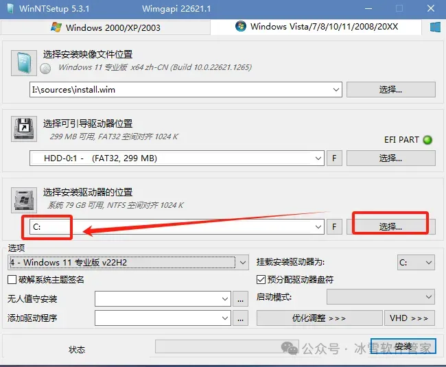 5.在安装磁盘的位置处,点击【选择】选择【C盘】。