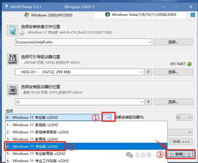 类型二:❶若上图标注①绿灯处显示为“EFI”:❷点击【选择】,❸选择【一个300MB左右的盘】(一般情况下默认会自动识别)。