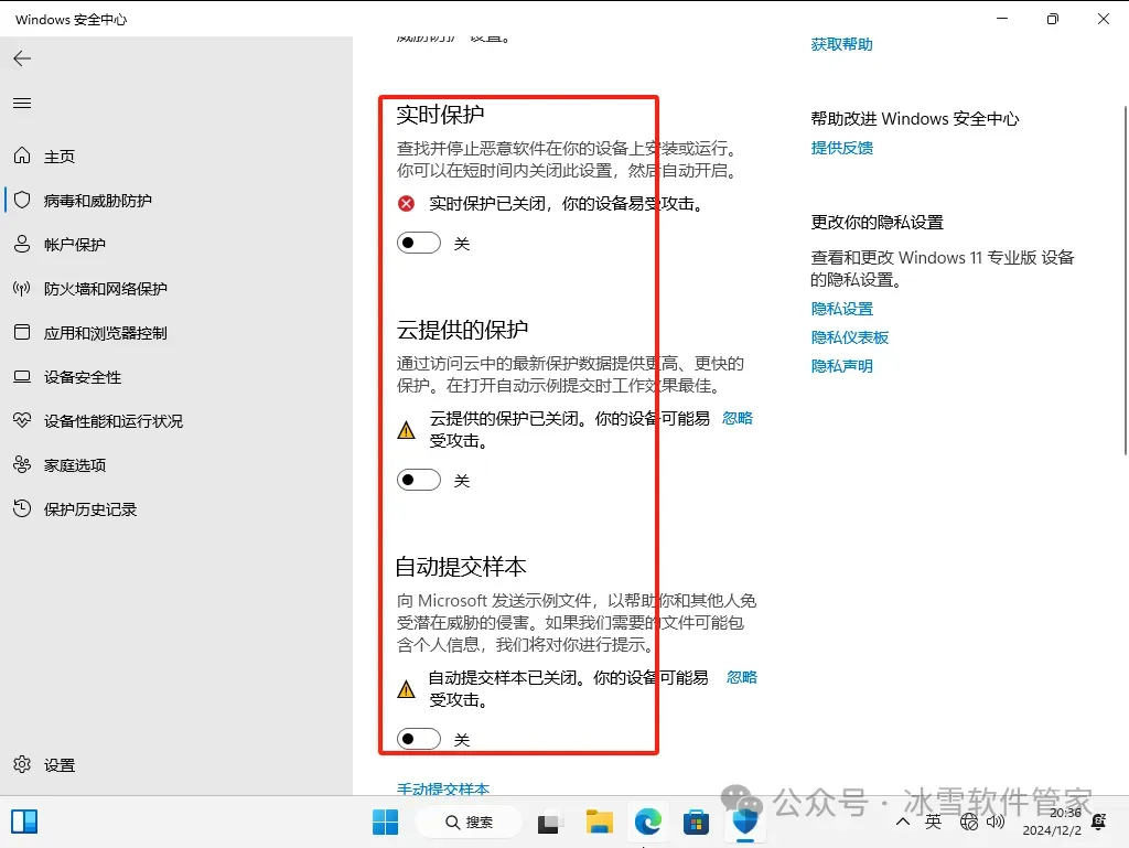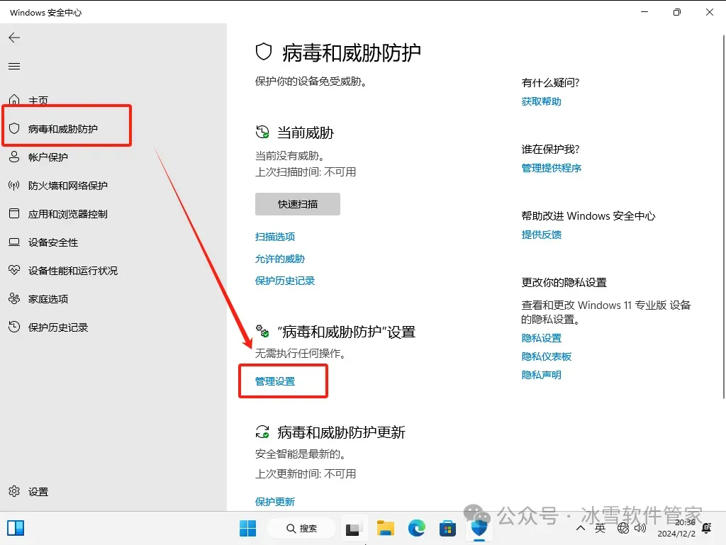2)点击病毒和威胁防护--管理设置--关闭实时防护