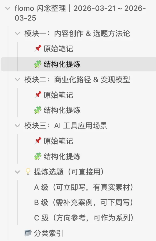 增量8条flomo闪念 → 整理成3个主题模块+10个可用选题, 一份文档落地 Obsidian,并同步到 ima知识库和Get 笔记, 而手动操作只有一个:从 flomo 导出 ZIP 文件。