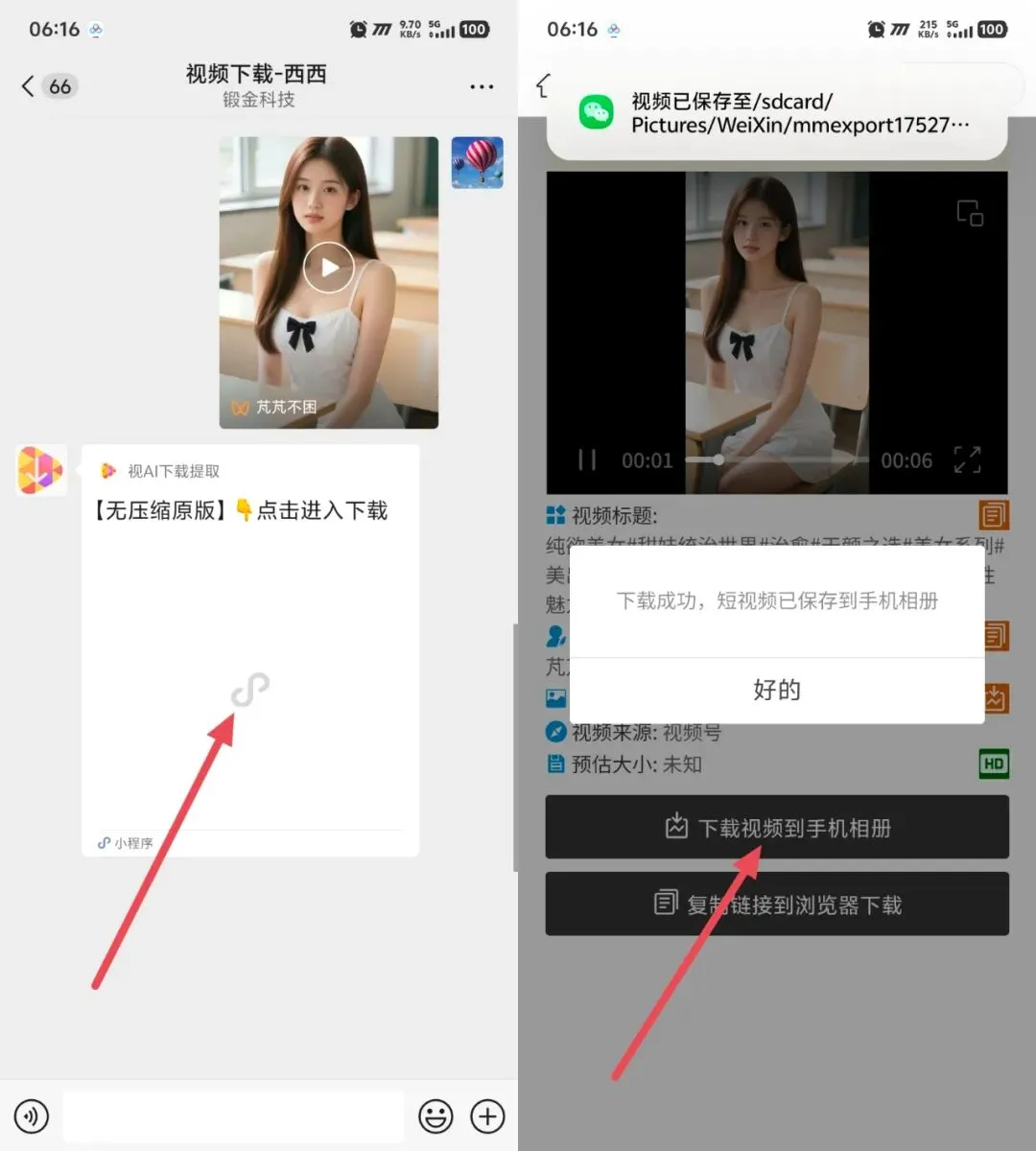 → 视频下载客服机器人会自动解析并返回下载小程序,进入小程序,就可以一键下载到手机相册了!