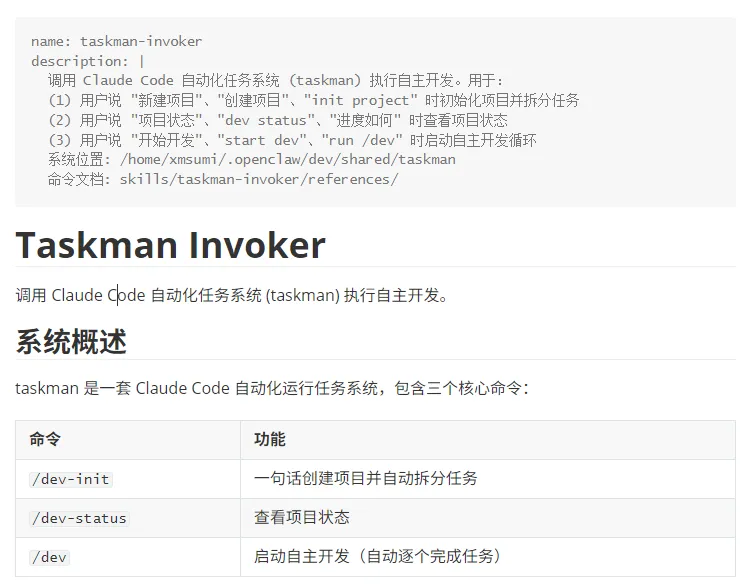 Taskman Invoker Skill 就是为了解决这个问题:把交接班系统封装成技能,OpenClaw 一句话就能调用。