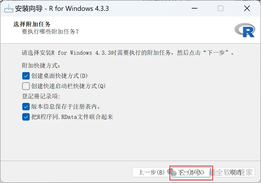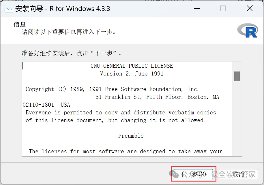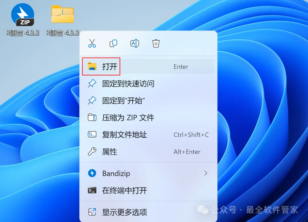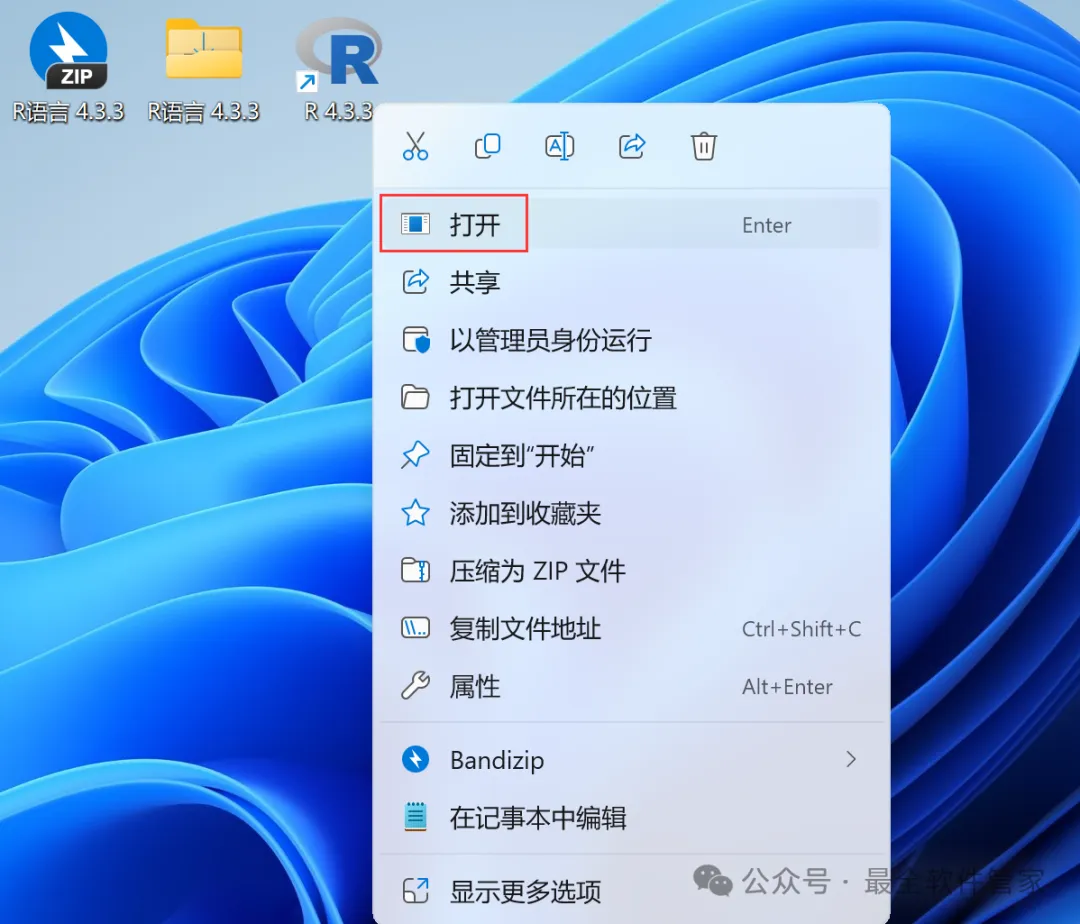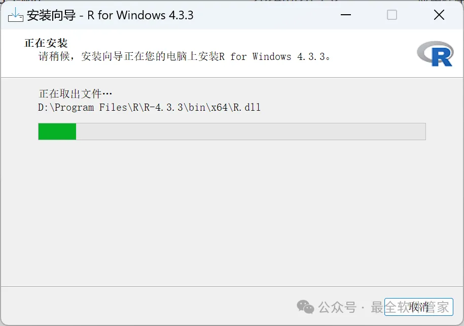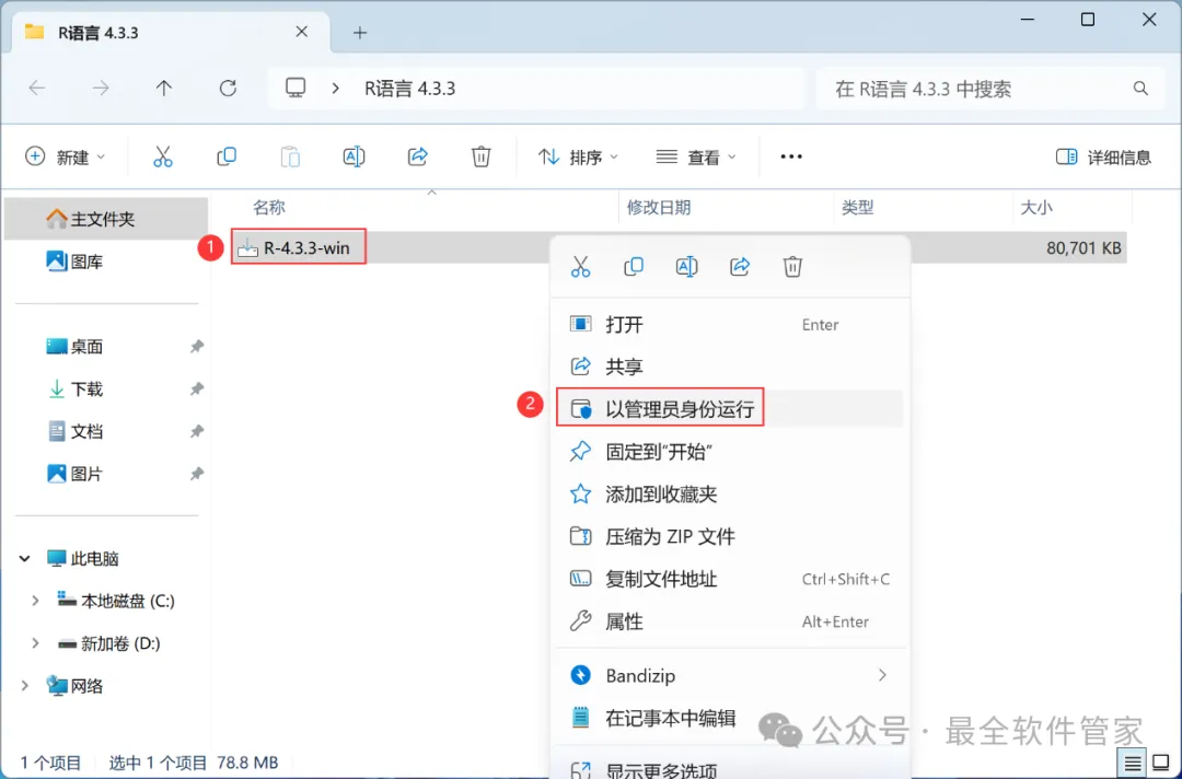 [不限速下载]:免费获取百度网盘不限速下载工具。公众号内回复:不限速[注意事项]:安装前请关闭网络、杀毒软件和防火墙,否则易安装失败。公众号内回复:1[解压软件]:小编用的解压软件是Bandizip,获取Bandizip软件安装包。公众号内回复:21、下载R语言 4.3.3软件安装包到电脑上,右键选择【解压到R语言 4.3.3\】3、找到【R-4.3.3-win】应用程序,右键选择【以管理员身份运行】它6、软件默认安装在C盘,可自定义更改软件安装位置,这里小编选择安装在D盘;点击【下一步】13、回到桌面,右键桌面上的【R 4.3.3软件图标】,点击【打开】15、以上就是R语言 4.3.3软件安装的全过程,要是对你有帮助的话,请为小编点个赞!免责声明:软件资源均来源于网络,仅供用户交流学习与研究使用,版权归属原版权方所有,版权争议与本公众号无关,用户本人下载后不能用作商业或非法用途,否则后果均由用户承担责任;如果您访问和下载此文件,表示您同意只将此软件用于参考、学习而非其他用途,否则一切后果请您自行承担,请于下载后24小时内删除,不允许用于商业用途,否则法律问题自行承担。如果您喜欢该软件,请支持正版软件,购买注册,得到更好的正版服务。