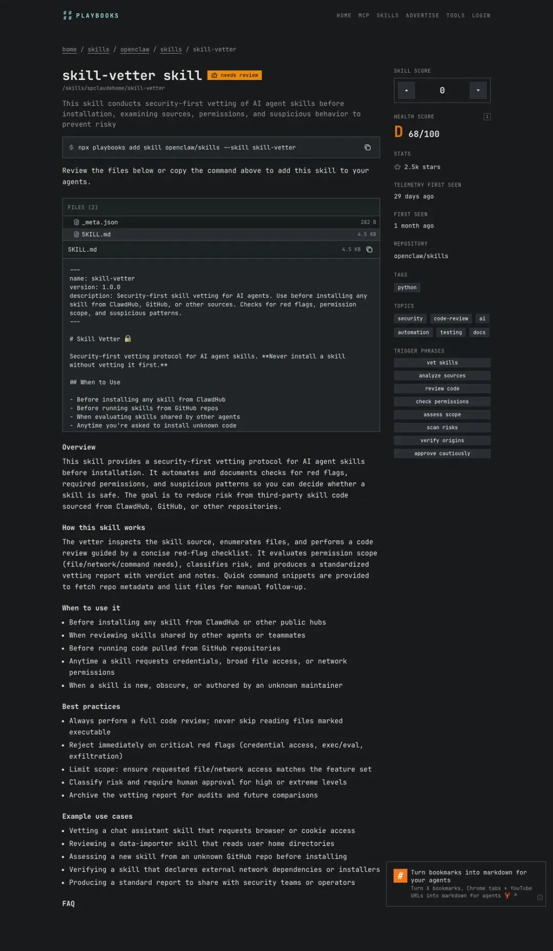 来源:https://playbooks.com/skills/openclaw/skills/skill-vetter