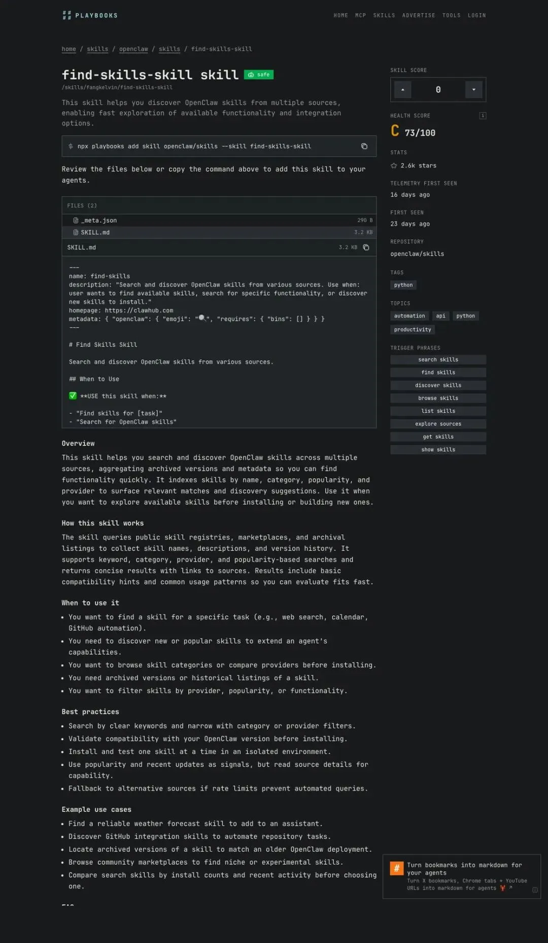 安装命令:npx playbooks add skill openclaw/skills --skill find-skills-skill