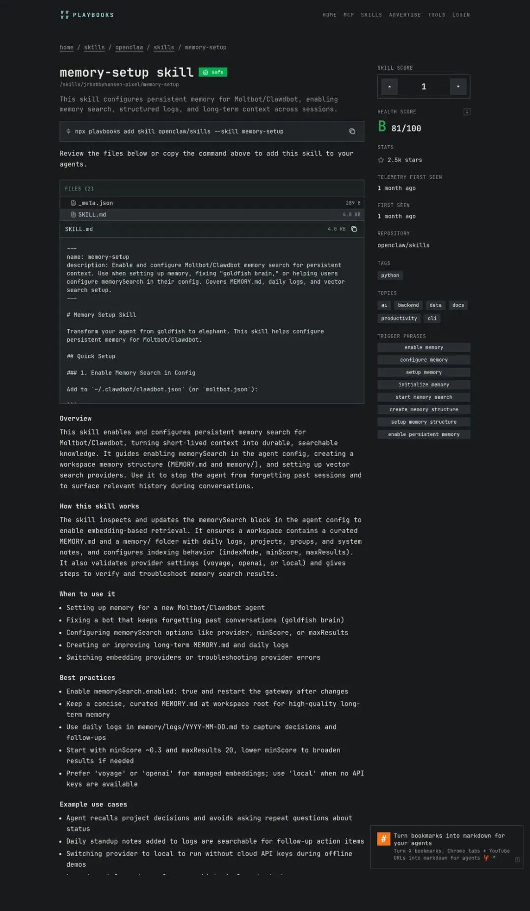 安装命令:npx playbooks add skill openclaw/skills --skill memory-setup