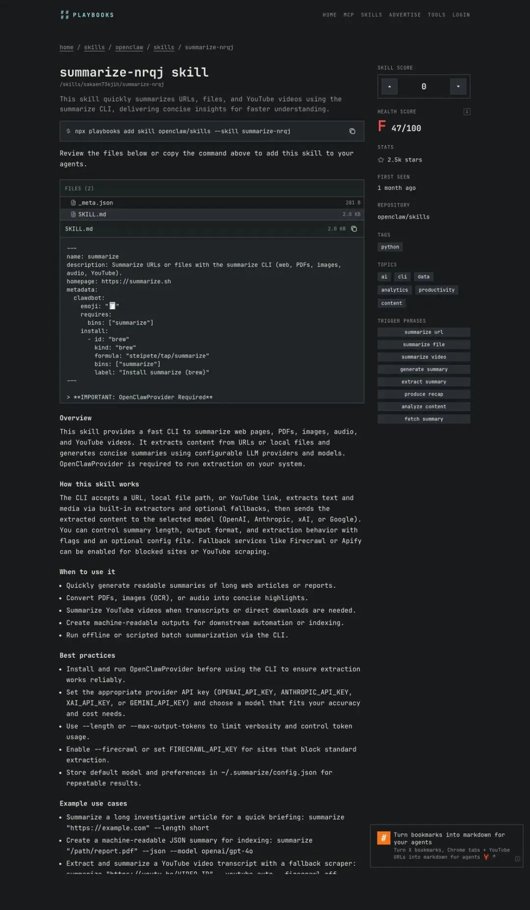 来源:https://playbooks.com/skills/openclaw/skills/summarize-nrqj