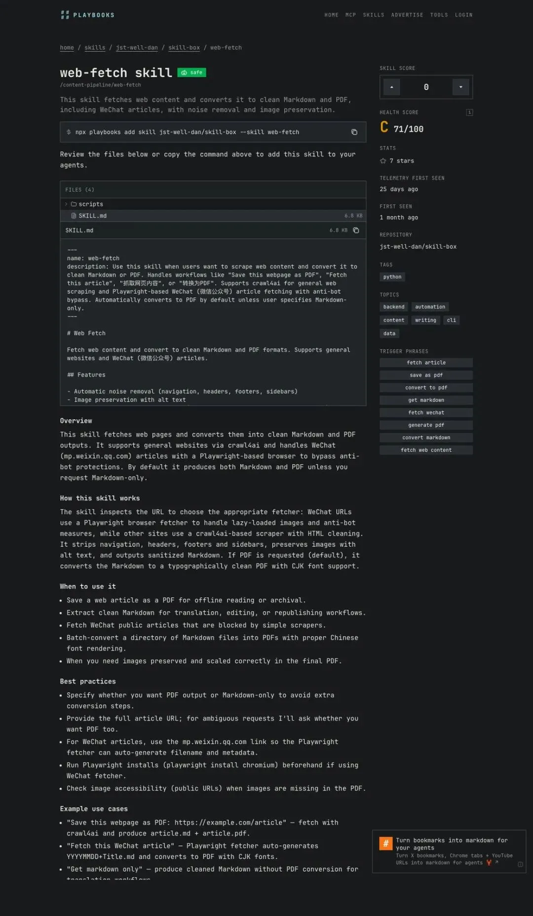 碰到网页不好复制、公众号文章不好整理的时候,它能把正文抓出来,转成更干净的 Markdown 或文本,方便后面继续喂给 AI 处理。