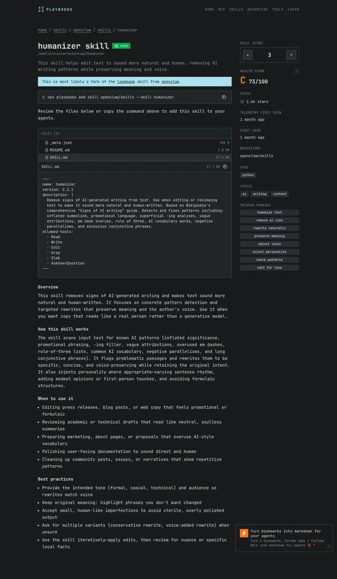 安装命令:npx playbooks add skill openclaw/skills --skill humanizer