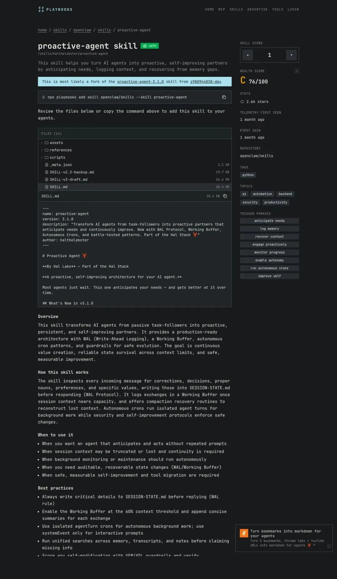 安装命令:npx playbooks add skill openclaw/skills --skill proactive-agent