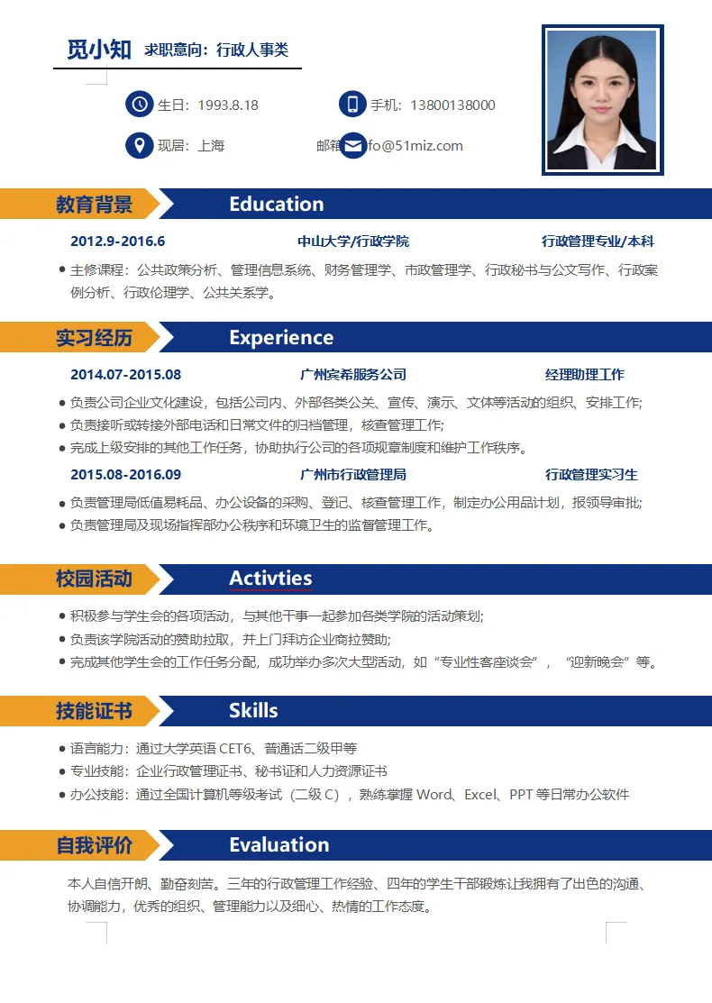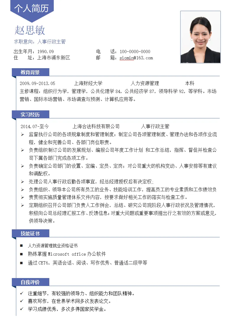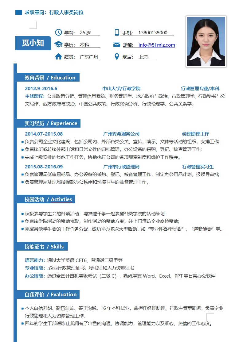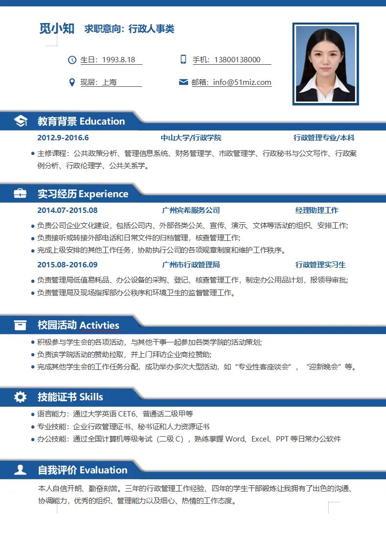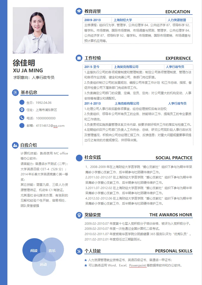 创意蓝色简约人事行政个人简历模板
