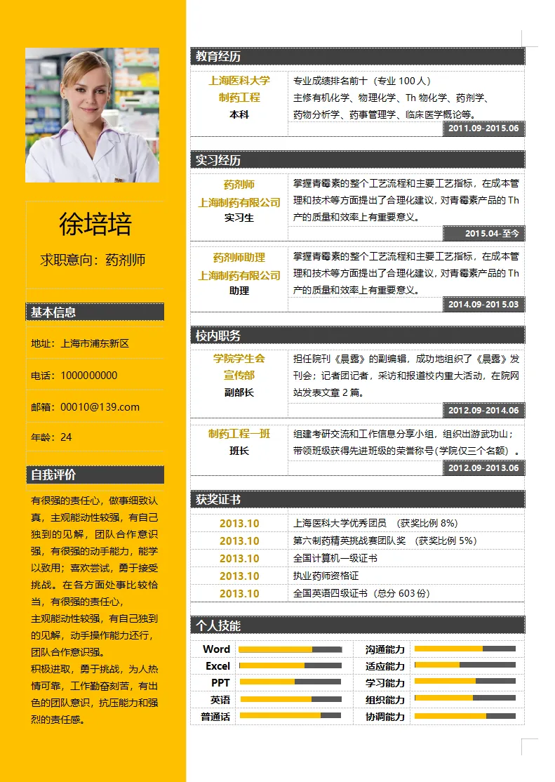 黄色创意药剂师护士医生实习生应届生大学生个人简历模板