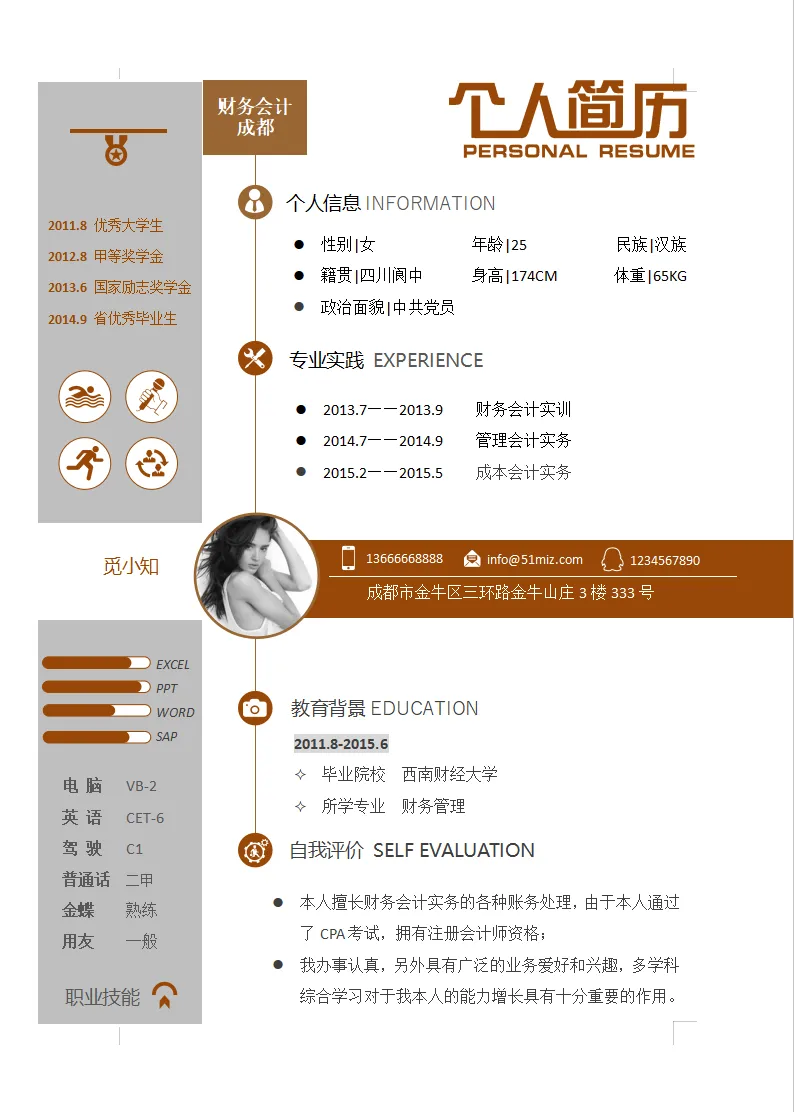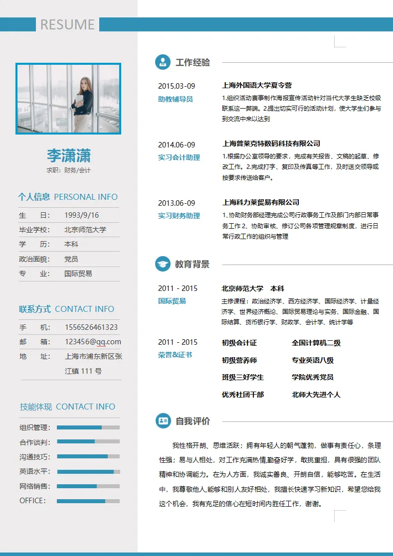 蓝色简约财务会计个人简历模板