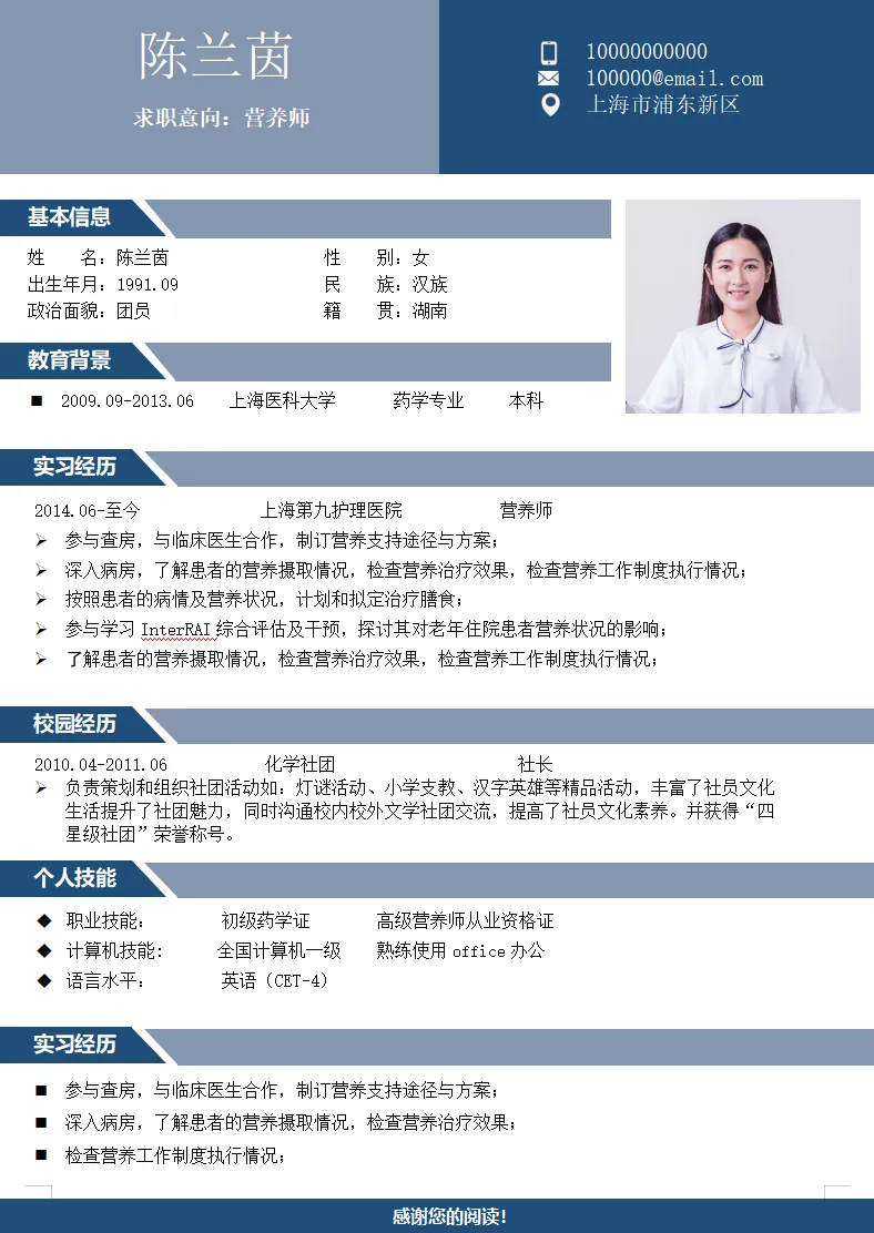 蓝色简约护理护士医生个人简历模板