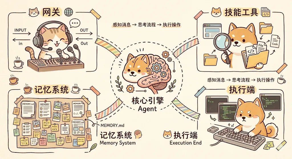 忘掉ChatGPT,OpenClaw用长期记忆和执行力重新定义AI01初识 OpenClaw —— 你的可自托管 AI 助手月末 办公桌总是被出差票据、杂乱截图和待填报销单占据,这或许是每个职场人的隐痛。如果你已经为 OpenClaw 配置了飞书接口、文件处理权限和公司报销模板,你只需在飞书发送指令:从下载目录提取上月发票信息并填入模板,它就会按既定边界自动执行。这种丝滑的体验并非来自简单的对话,而是源于 OpenClaw 强大的 Agent 范式。大多数人对 AI 的认知仍停留在“聊天网页”阶段,即问即答,关闭标签页即意味着记忆清零。OpenClaw 是一款开源、可自托管的个人 AI 助手系统,它不只是对话,更能通过感知环境、调用工具并保持长期记忆,成为你真正能干活的数字员工。本章学习目标读完本章,你将会:* 理解传统对话式 AI 的局限性及 Agent 范式* 掌握 OpenClaw 的核心定位与自托管优势* 了解典型使用场景与四大核心架构模块* 通过“5 分钟快速体验”建立直观预期02为什么传统的 AI 聊天机器人不够用?“一问一答”的天花板日常使用的 ChatGPT 或 Claude 网页版,本质上是“被动响应式”工具:你发一条指令,它回一段文字。关掉网页,它就立刻“失忆”。这种交互模式存在四个根本性的瓶颈,它们像枷锁一样限制了传统 AI 在实际生产中的表现:无记忆持久化:每次新对话都从零开始,无法记住你上周说过什么。由于缺乏长期记忆,用户被迫陷入无效的重复教学,重复沟通成本极高。无执行能力:只能生成文字,不能操作文件、浏览器或系统。强大的文字生成能力背后是执行力的缺失,导致输出无法直接落地。无自主性:必须你主动发起对话,它才会响应。这意味着它无法感知环境变化,也无法 7x24 小时工作。无协作能力:属于单一模型单一对话,无法多角色并行。在面对复杂任务时,这种单兵作战的模式效率低下。简单来说:传统 AI 只能生成文字,不能操作任何外部系统。你需要的是一个能直接执行任务的 AI 助手。从“对话 AI”到“智能体 AI”的范式跃迁业界正在经历一场从 Chatbot(聊天机器人)到 Agent(智能体)的范式跃迁。两者的本质区别在于:* Chatbot = 大语言模型 + 对话界面* Agent = 大语言模型 + 感知能力 + 执行能力 + 记忆系统 + 自主决策循环OpenClaw 正是这一方向的产物。它是一个开源的、可自托管的个人 AI 助手系统,运行在你的本地电脑或云服务器上,拥有完整的感知-思考-执行闭环。它和普通对话 AI 的核心区别:能调用工具:OpenClaw 可以打开浏览器提取网页数据、读写本地文件、执行 Shell 命令。它不只是生成文字,而是能直接操作你的系统。支持定时和后台任务:OpenClaw 内置了 Cron(按固定时间运行任务)和 Heartbeat(按固定节奏做巡检),可以把一些重复工作放到后台执行。长期记忆:它通过工作区里的记忆文件保存长期信息。你之前确认过的偏好、约束和重要结论,后续可以再检索出来。03OpenClaw vs 主流 AI 工具:差异对比在深入了解 OpenClaw 之前,我们先把它和你可能已经在用的 AI 工具做一个横向对比。从部署方式与数据主权来看,ChatGPT 网页版属于 SaaS 云服务,数据由服务商托管。而 OpenClaw 支持完全自托管,数据放在哪完全由你决定。在持久记忆与执行能力上,传统网页 AI 的记忆有限,Copilot 基本没有。OpenClaw 则通过工作区记忆文件配合检索实现了深度沉淀。此外,OpenClaw 支持 Cron / Heartbeat 后台任务及多 Agent 配置,而主流工具仍以手动触发为主。它原生集成了飞书、钉钉、Telegram 等渠道。一句话总结:ChatGPT 更像对话产品,Copilot 更像代码辅助工具,而 OpenClaw 更像一个可以自己部署、自己接权限、自己定规则的 AI 助手系统。04典型使用场景分析多智能体协作OpenClaw 支持配置多个 Agent。这里的 Agent 可以理解成“分工不同的助手实例”;每个 Agent 都有自己的身份和职责。注意:多智能体的配置通过 openclaw.json 中的 agents.list[] 和 bindings[] 实现。AGENTS.md 只是工作区提示文件,不是系统配置文件。DevOps 自动化这是开发者群体中常见的场景。满足前提后,你可以让 OpenClaw 在收到线上报错时:接收通知、分析日志、执行修复操作并通知你审核结果。内容生产辅助内容创作者可以让多个 Agent 分工协作:"研究员"负责素材收集,"写手"生成初稿,"审校"负责检查事实准确性和格式。更多应用方向智能客服:自动回复客户咨询,通过浏览器工具与记忆检索处理复杂问题。学术助手:追踪最新论文动态,利用浏览器抓取内容并生成文献综述。数据监控:借助 Cron 定时任务拉取数据,发现指标异常时发送告警。竞品监控:定期抓取竞品动态并记录,自动生成深度的对比分析报告。05OpenClaw 的核心架构OpenClaw 的核心由四大模块协同运作:Gateway(网关)、Agent(引擎)、Skills/Tools(技能与工具)、Memory(记忆系统)。Gateway(网关)Gateway 是 OpenClaw 的常驻服务进程。它负责:接收外部消息、路由和分发、鉴权安全,并提供内置的 Web 聊天界面及 API 接口。Agent(智能体引擎)Agent 是真正执行任务的核心。每个 Agent 拥有独立的身份和行为模式,工作流程是一个完整的 “感知 — 思考 — 执行 — 反馈” 循环。Tools 与 Skills(工具与技能)内置工具(Tools):OpenClaw 自带的能力。包括浏览器操作 (browser)、文件系统工具、系统命令 (Shell 执行) 以及记忆检索系统。技能(Skills):通过 ClawHub 技能市场安装的扩展能力。每个 Skill 以 SKILL.md 为核心描述文件,使
