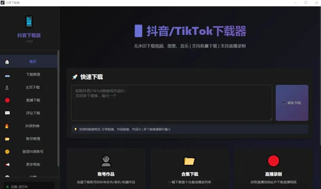 今天小编给大家分享一款抖音视频批量下载器 高清无水印视频,可以下载单个作品,可以快速下载作者主页批量下载。也支持TIKTOK下载需要的自取。