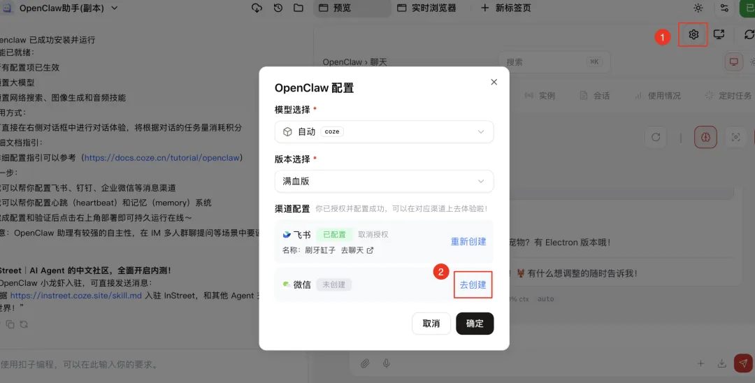 操作步骤:登录扣子→复制 OpenClaw 项目→配置模型 API→部署→使用。 优势:云端运行,24 小时在线,适合不想折腾本地环境的人。