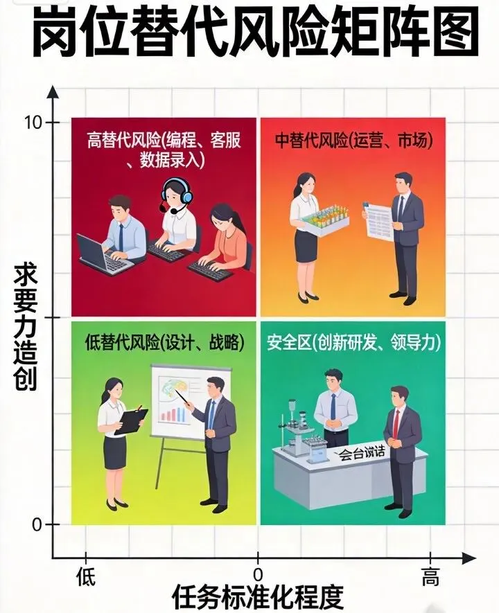 智联招聘2026年Q1数据:初级程序员岗位招聘量同比下滑超50%,AI相关岗位需求暴涨12倍。任务标准化程度越高、创造力要求越低的岗位,被替代风险越大。
