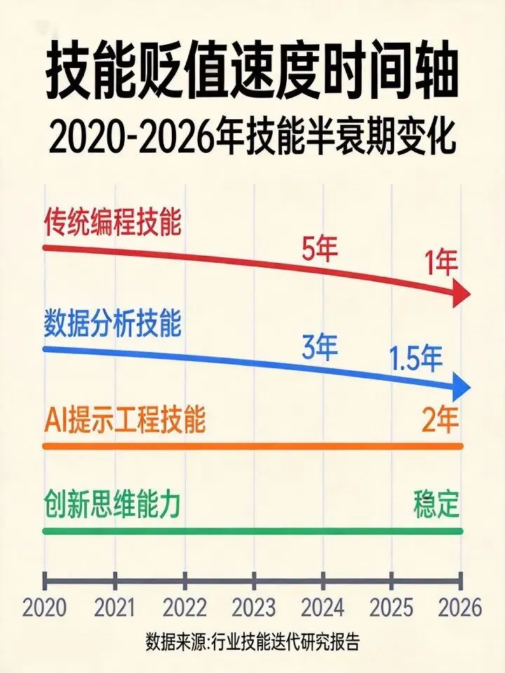 技能贬值时间轴揭示残酷现实:传统编程技能半衰期从2020年的5年缩短到2026年的1年。