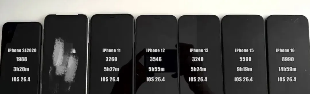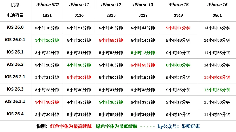 iOS 26.4 正式版系统电池续航结果出来了, 整体上涨,13又拉了;数据仅供参考!