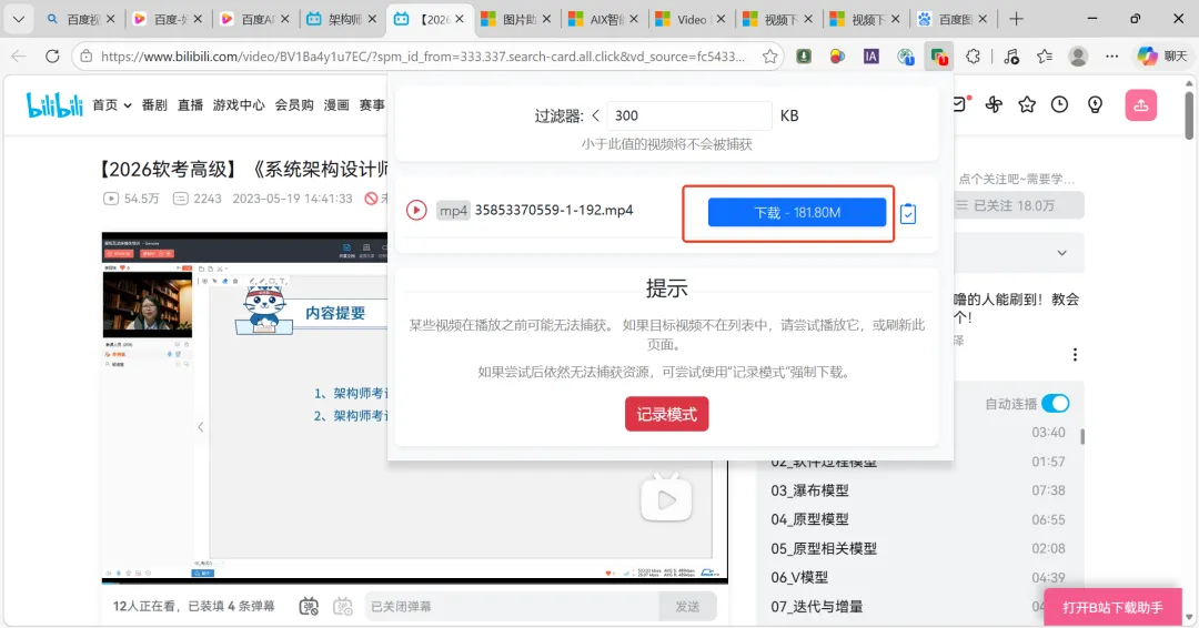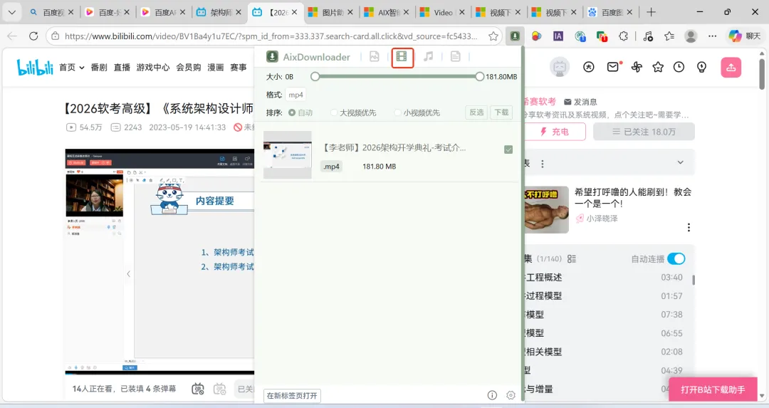 点击工具栏固定好的AixDownloader图标,扩展会自动扫描当前页面所有可下载视频;