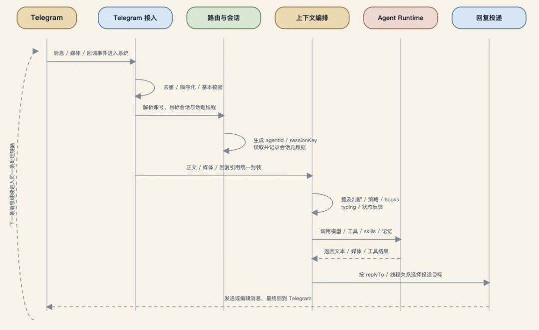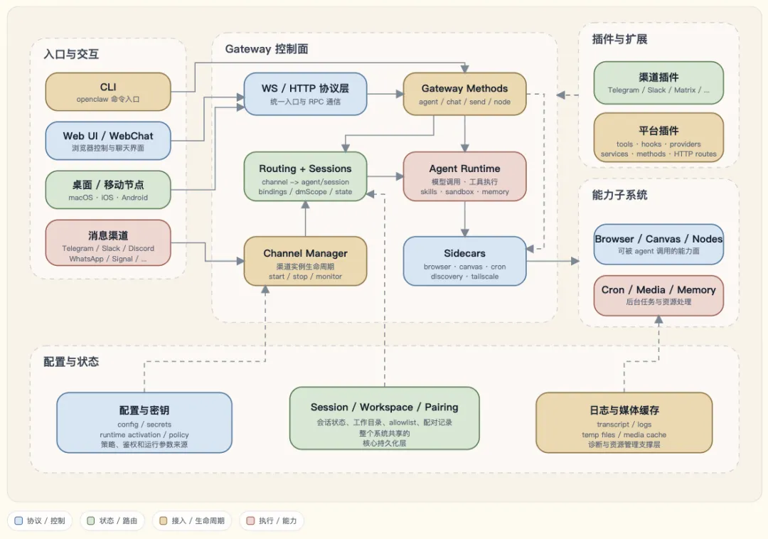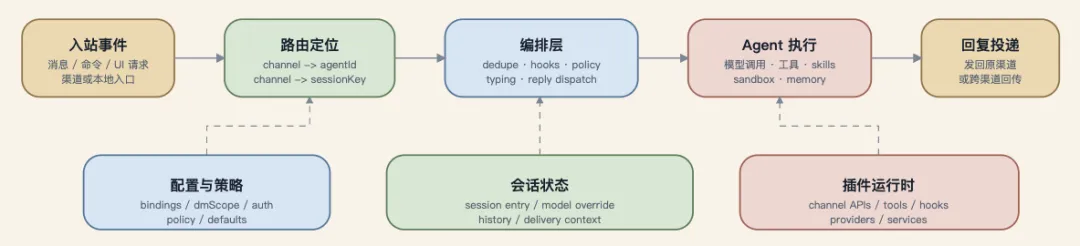它的上层对接多渠道输入,下层连接会话路由、插件体系、记忆模块及运行时,核心则是一条标准化的执行主线。