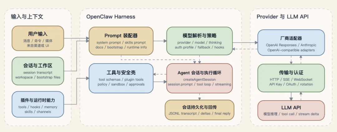 那么OpenClaw究竟如何同LLM协同工作呢?答案就在其 Harness 层。