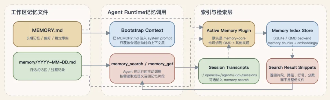 此外,后台存在一个记忆索引与检索层,它会将MEMORY.md和memory/*.md的内容为每个agent构建独立的SQLite索引。该索引层主要负责分块、嵌入和检索,其本身不存储记忆原文。