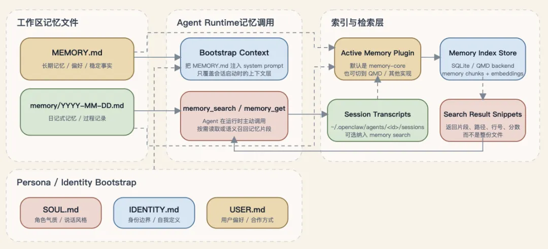 值得一提的是,关于“小龙虾”的个性设定文件(如SOUL.md / IDENTITY.md / USER.md等),尽管它们也作为启动时的人设上下文,但并未纳入memory_search的索引体系,因此在严格意义上不算是记忆,而应归类为人格/身份注入。