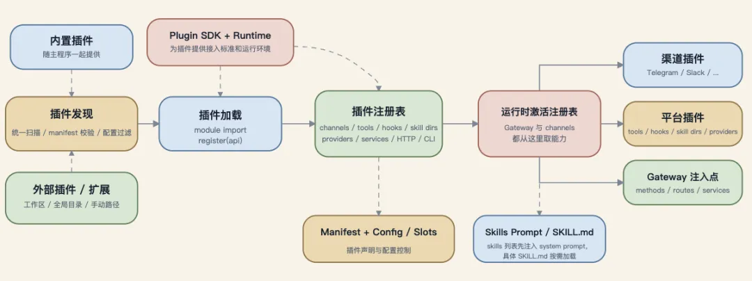 下方的图示展现了插件从“发现、装载、注册到运行时激活”的整个生命周期,并说明了Plugin SDK是怎样支持各类插件的。