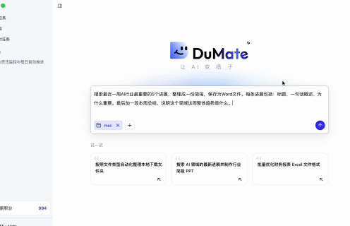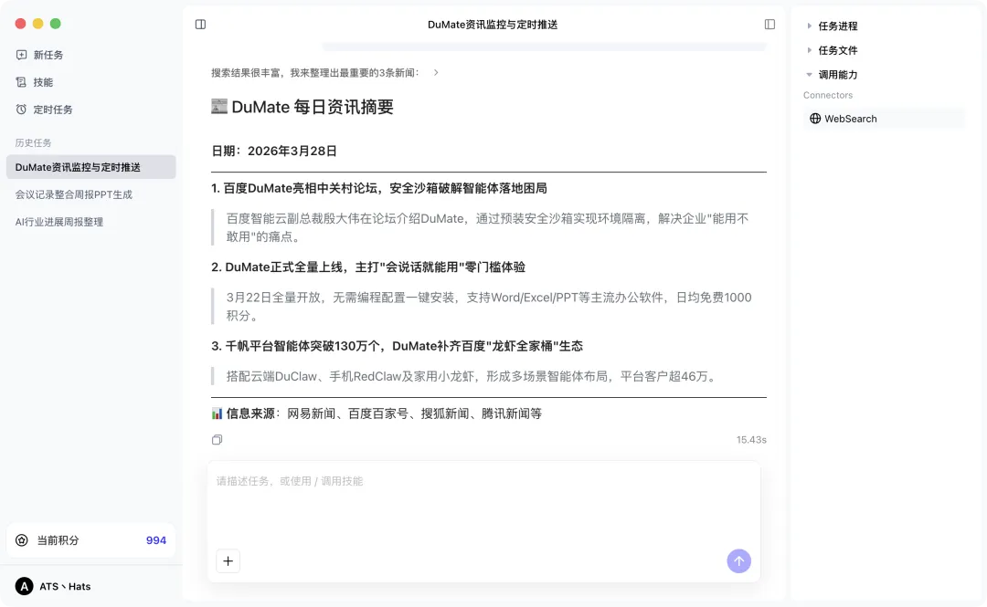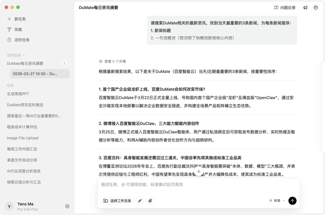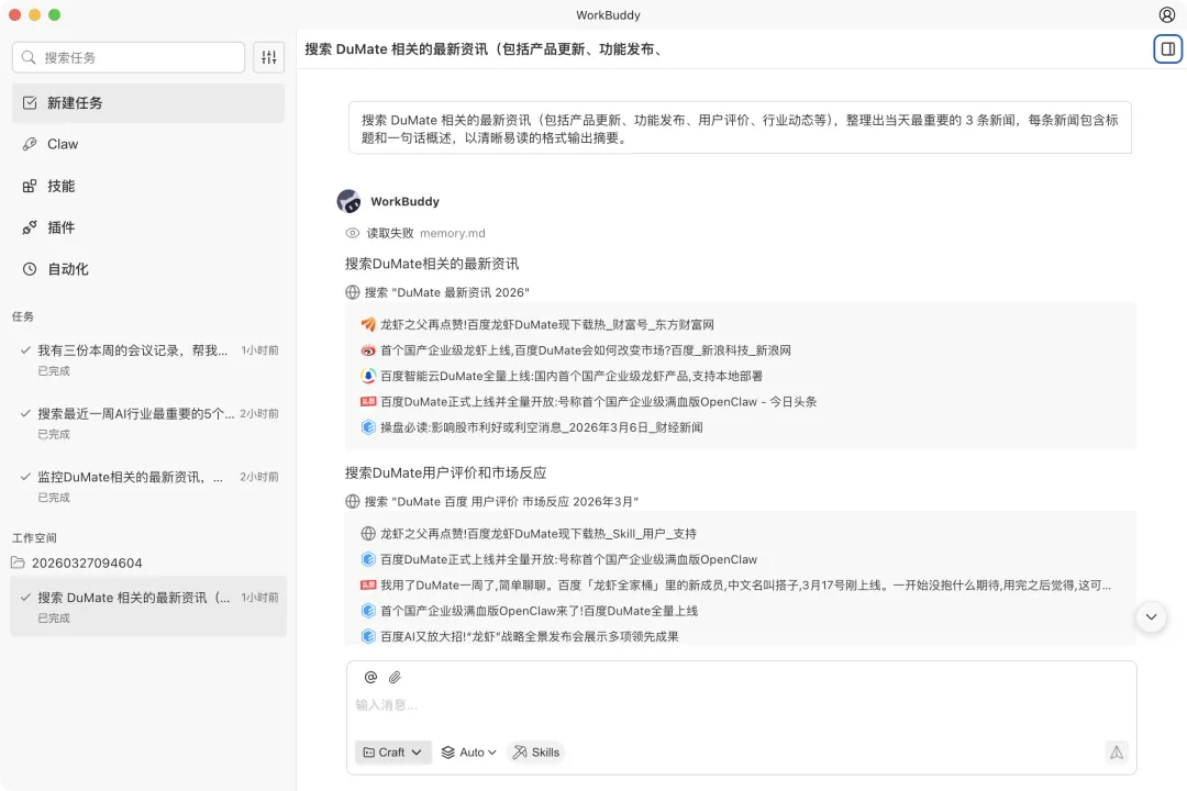 DuMate和WorkBuddy都可以,内容质量差不多,但DuMate快将近一倍。