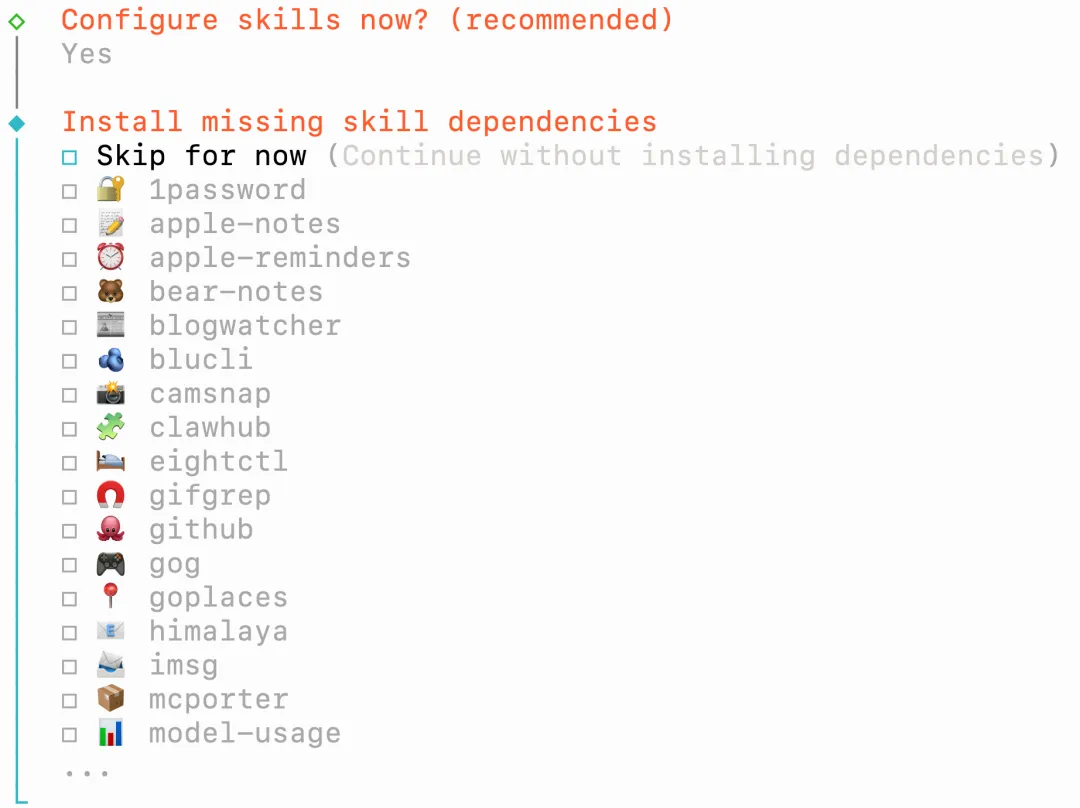 配置技能,配置一个github、clawhub,按空格选中