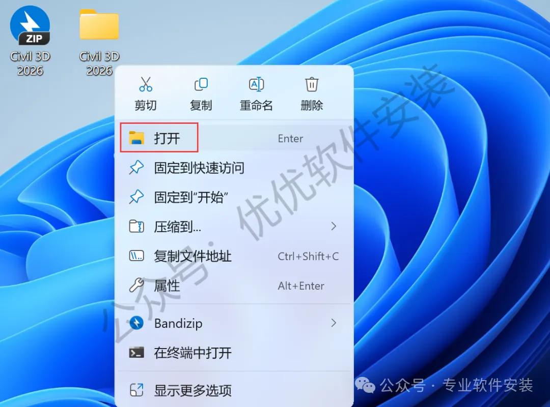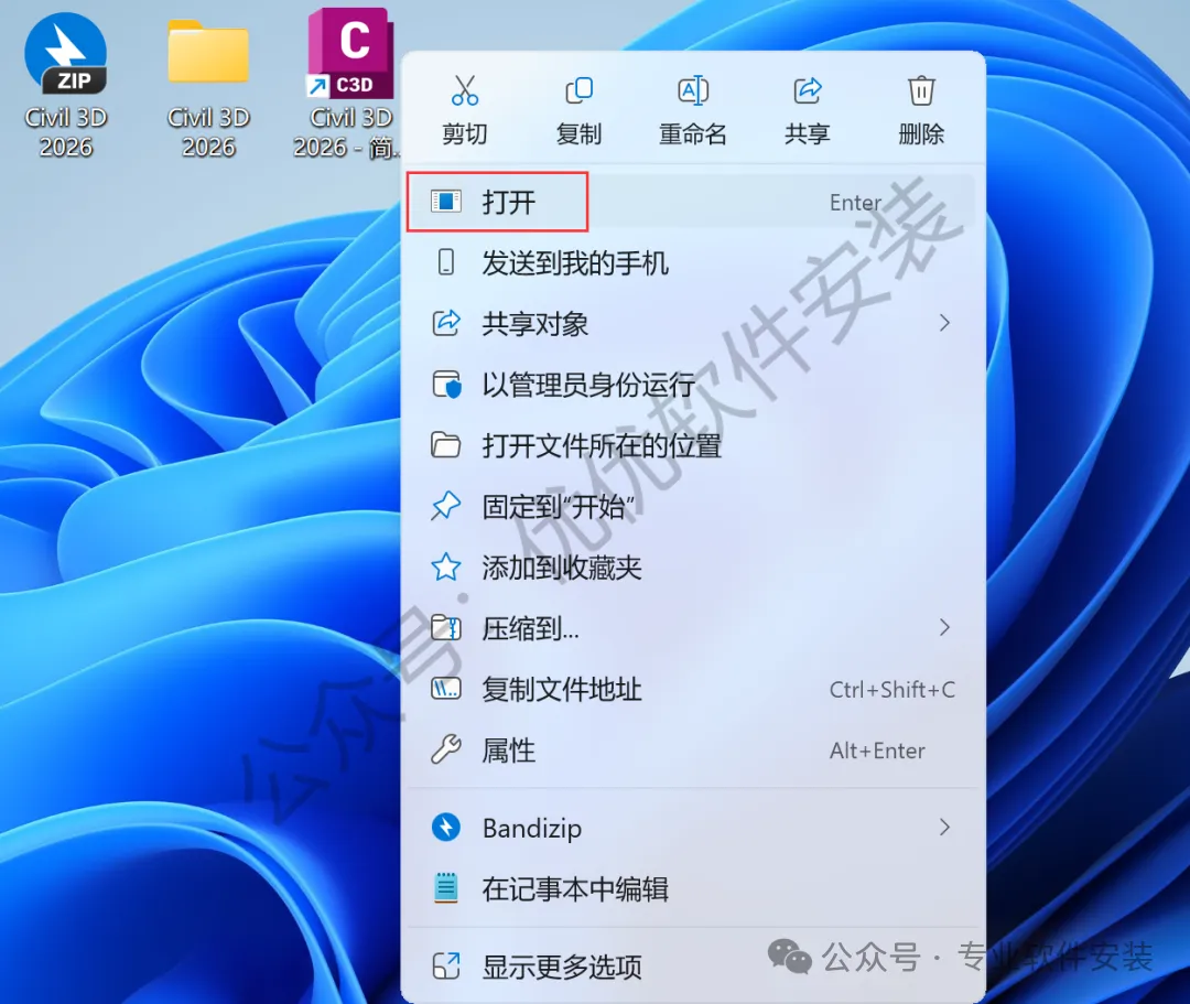 14、回到桌面,右键桌面上的【Civil 3D 2026软件图标】,点击【打开】
