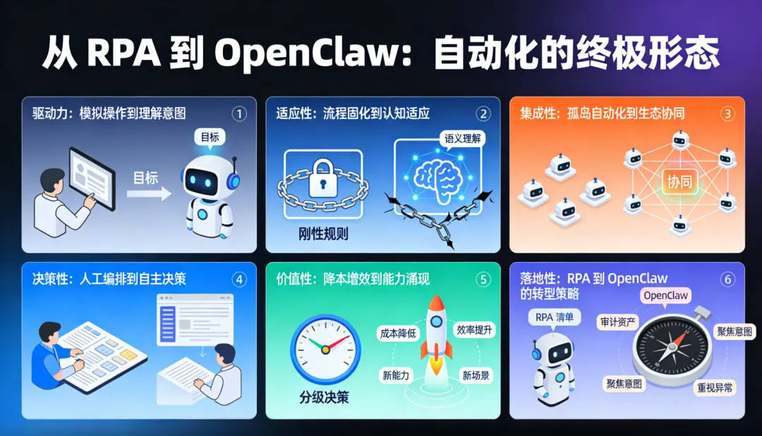 RPA 和 OpenClaw 并非非此即彼的竞争关系,而是自动化成熟度曲线上的不同阶段。对于流程稳定、边界清晰、规模有限的场景,RPA 依然是高性价比的选择。而当你的自动化版图扩展到需要跨系统协同、处理非结构化数据、应对动态变化的领域,OpenClaw 所代表的新范式就不再是奢侈品,而是必需品。